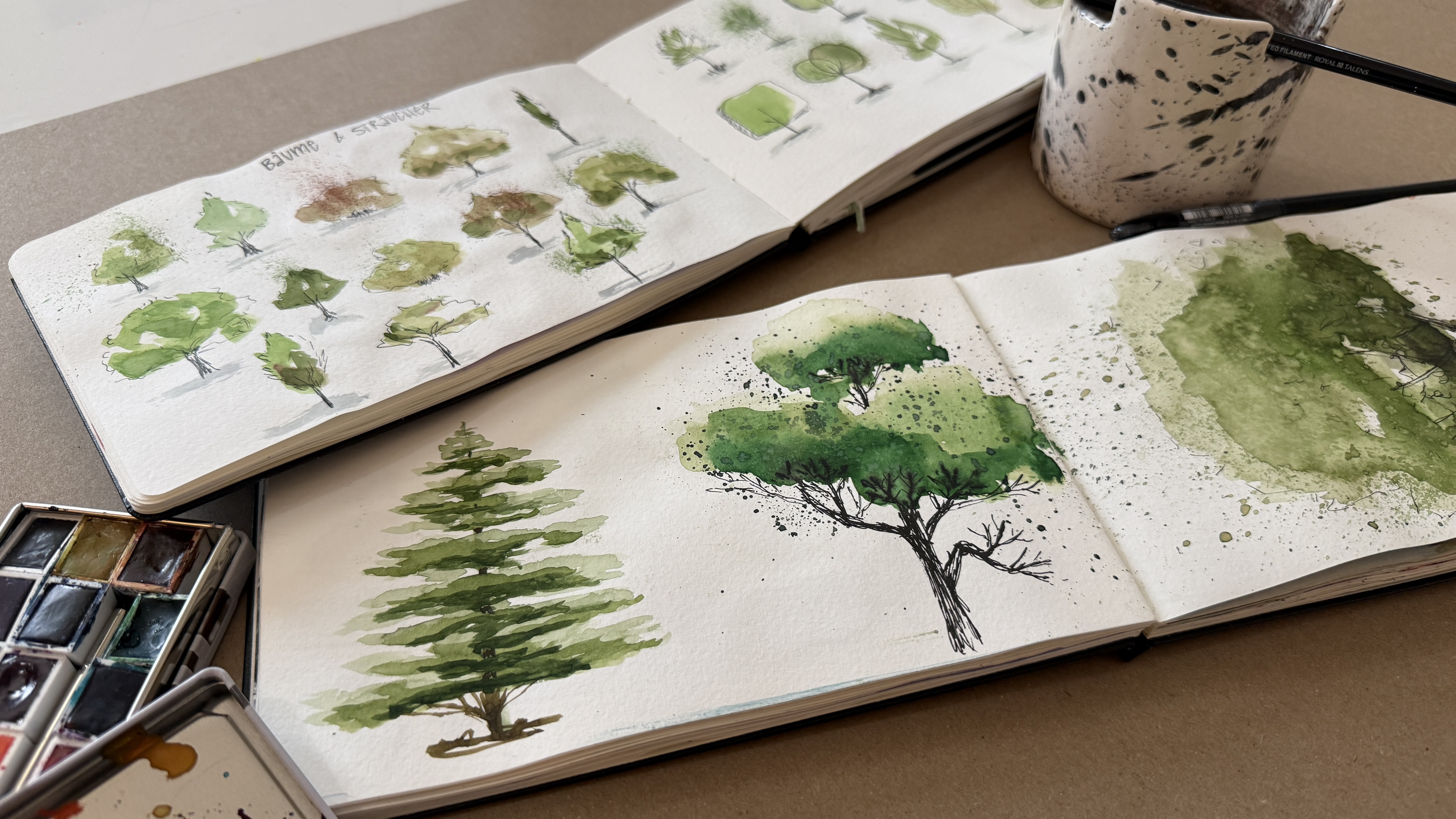 Wir erkunden Bäume, Sträucher und Pflanzen. Du lernst unterschiedliche Zeichenstile für Bäume kennen und erfährst, wie du Vegetation in deinen Sketch einbaust, damit sie natürlich und stimmig wirkt.